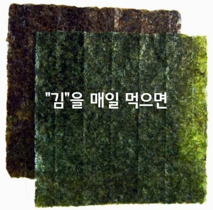 체내 단백질, 지방, 당의 대사에 관여하는 리보플라빈이 풍부하게 들어 있다. 리보플라빈이 부족하면 인체 내 점막층이 얇아져 여성의 경우 질 내벽 건조-충혈 등으로 인해 성관계 도중 통증을 느끼는 원인이 된다. 김에는 100g당 4.8g의 섬유소가 들어있어, 체내 불순물을 배출하고 미세순환을 촉진시켜 다이어트에도 효과적이다. 매일 아침 공복에 1~2 그릇 정도의 김 국을 마셔주면 변비 해소에 좋다.